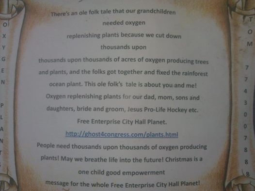 Dad, mom, soldier oxygen city perfecting grace behaviour planet before we were born ! Sacred love. From California to Cape Cod our Beautiful Earth GHOST4CONGRESS.COM Bumper Sticker, Poster Planet is a 10/4 . 8-15/24 ! God's Star's in the sky and our children in our heart's. We, they need Oxygen Plant's and Beautiful Earth GHOST4CONGRESS.COM/PLANTS.HTML Bumper Sticker, Poster Planet To have a beautiful city hall America. We can landscape the inside of the city hall buildings.Thank's to God we can feed this whole Beautiful Earth City hall's GHOST4CONGRESS.COM Bumper Sticker, Poster Planet faster today.